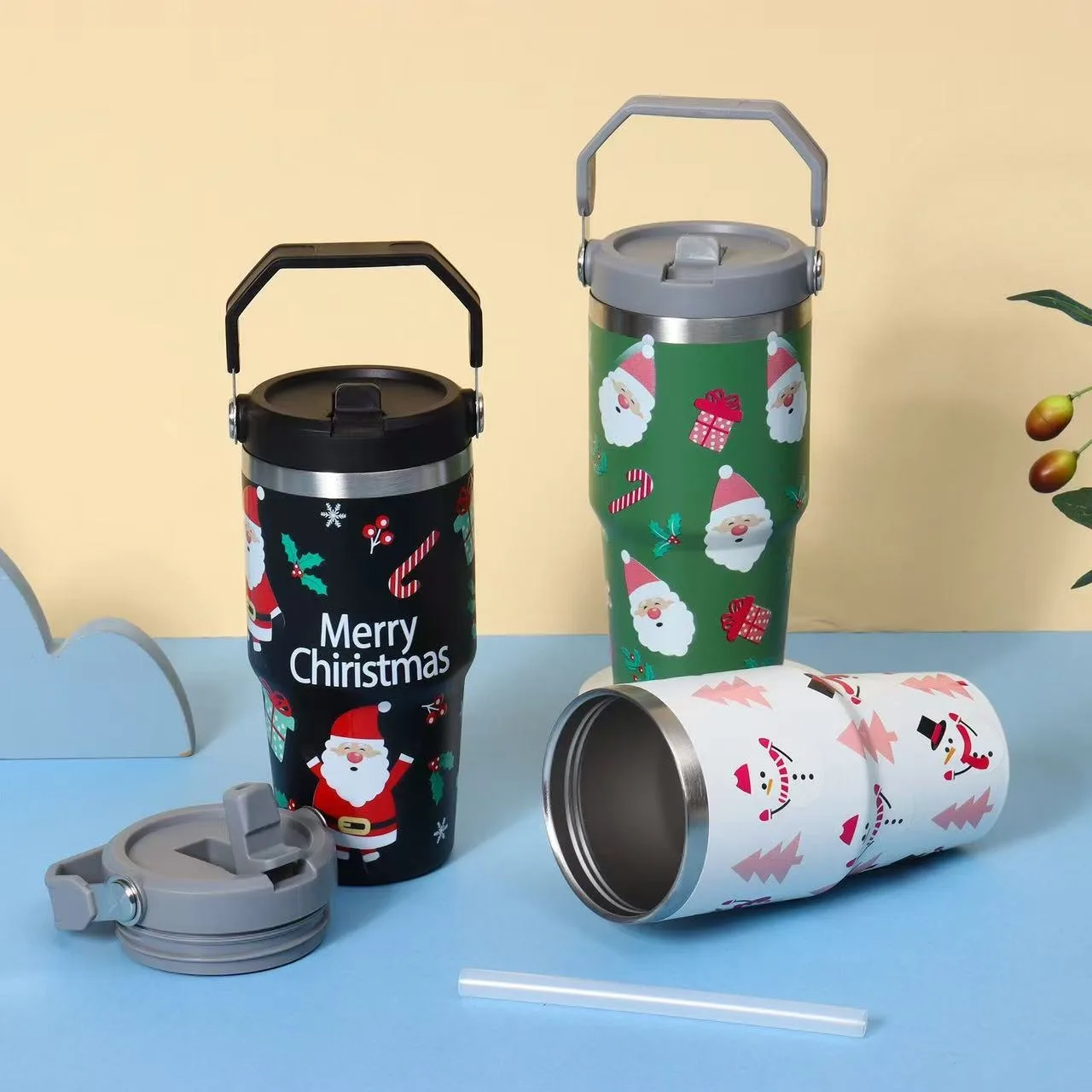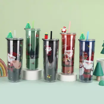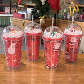 Festive Christmas Drink Cups With Straw and Ornaments Holiday Plastic Tumblers for Family Party Use